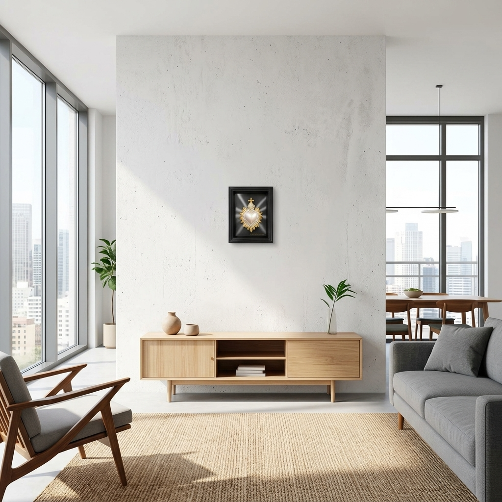 Quadro decorativo che celebra il sacro con eleganza e raffinatezza. La composizione presenta un cuore in tonalità bianco perlato che cattura la luce, arricchito da dettagli in oro che creano riflessi luminosi e movimentati. Perfetto per ambienti che richiedono un tocco di spiritualità e bellezza estetica, questo pezzo combina simbolismo profondo con una palette cromatica sofisticata. Ideale per chi desidera aggiungere significato e luminosità alle proprie pareti.