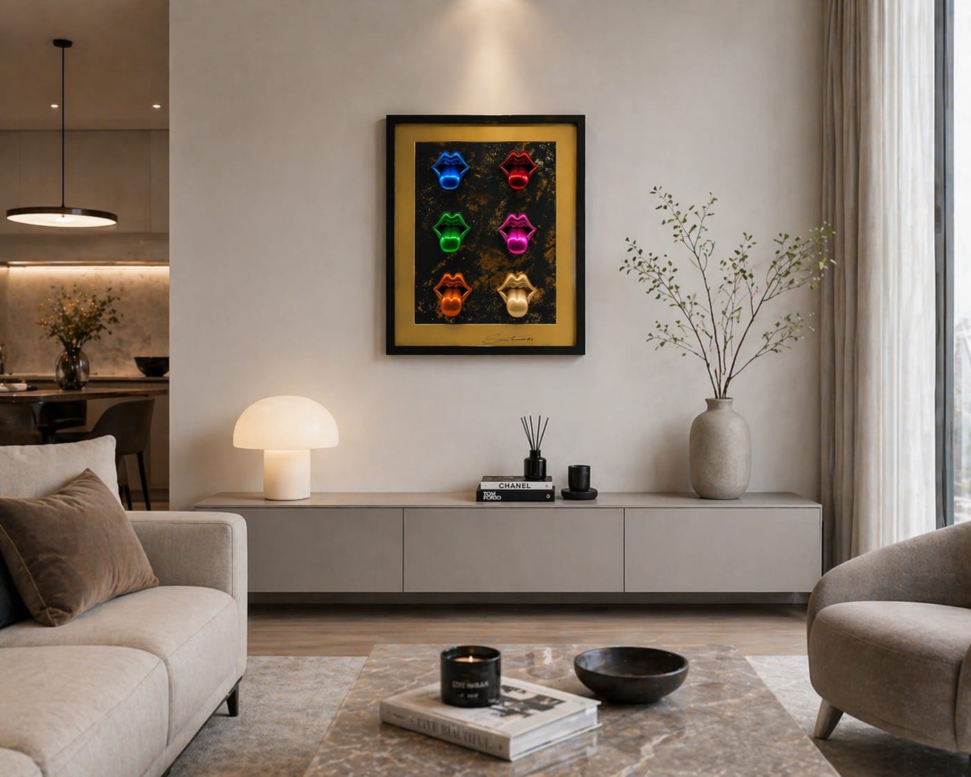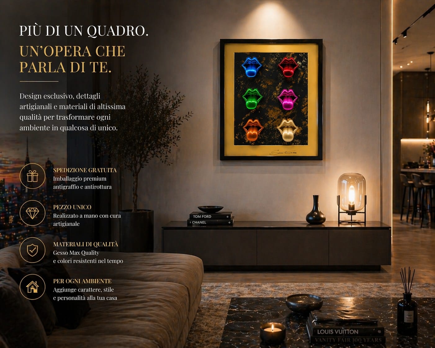 Un'opera d'arte contemporanea che cattura l'essenza della passione e dell'energia del rock. Questo quadro di grande formato celebra il momento iconico di un bacio, reinterpretato attraverso una lente moderna e audace. Perfetto per chi desidera aggiungere carattere e dinamismo agli spazi abitativi o professionali. Le dimensioni generose permettono all'opera di diventare un vero punto focale della parete, creando un'atmosfera sofisticata e al contempo ribelle. Ideale per collezionisti di arte contemporanea e appassionati di cultura rock che cercano un pezzo unico e memorabile.